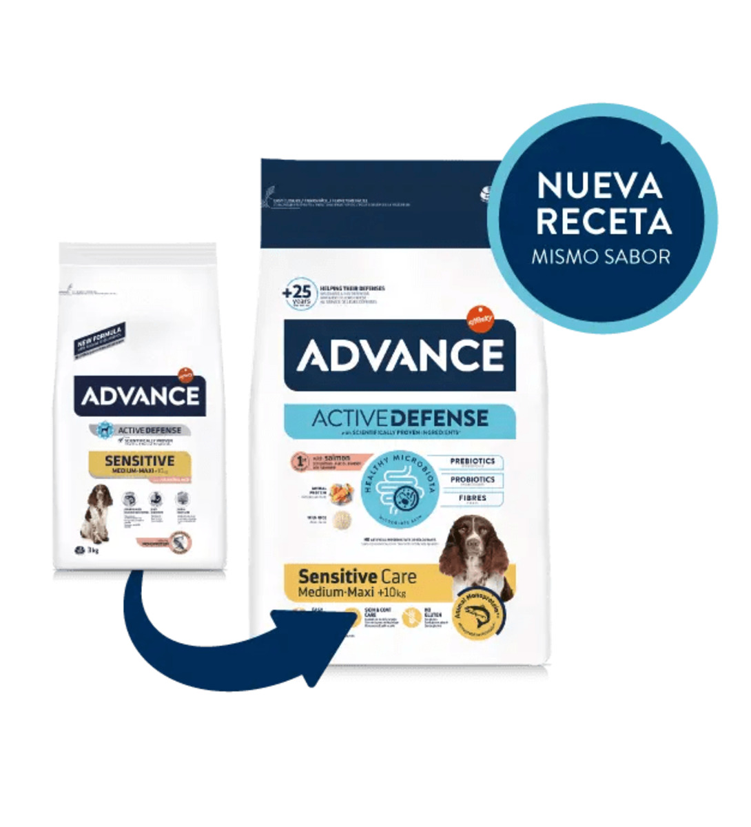 ADVANCE Sensitive Medium/Maxi (+10 kg) es un alimento completo y equilibrado especialmente formulado para perros con sensibilidad digestiva. La sensibilidad digestiva puede manifestarse a través malas digestiones y de forma ocasional a través de síntomas cutáneos.