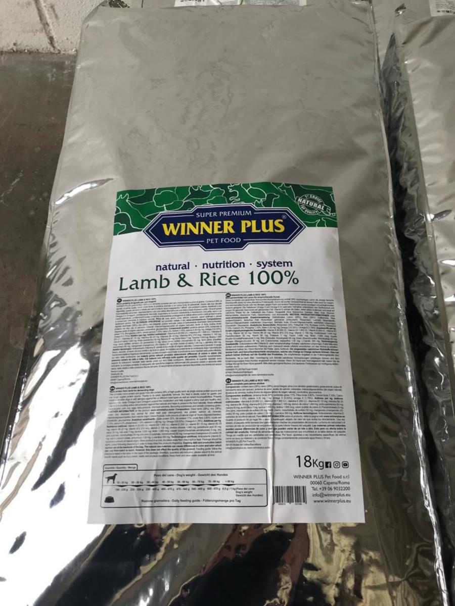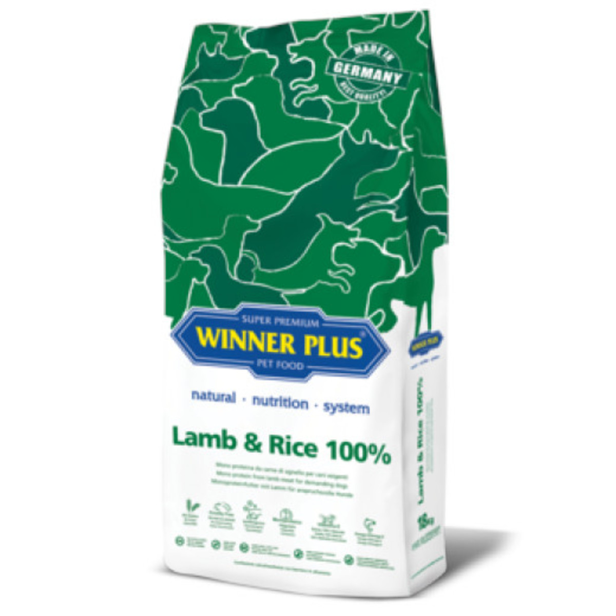 WINNER PLUS Lamb & Rice 100% es un alimento mono- proteico completo, compuesto exclusivamente por carne de cordero de alta calidad y controlada con los mismos estándares utilizados para de proteína animal y única fuente de carbohidratos.