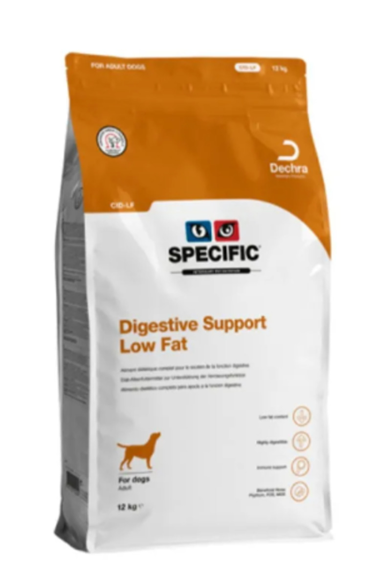 SPECIFIC™ Digestive Support Low-Fat es un alimento dietético completo para perros con procesos gastrointestinales agudos y crónicos asociados a diarrea, vómitos y/o flatulencias, especialmente si mejoran con una dieta baja en grasa