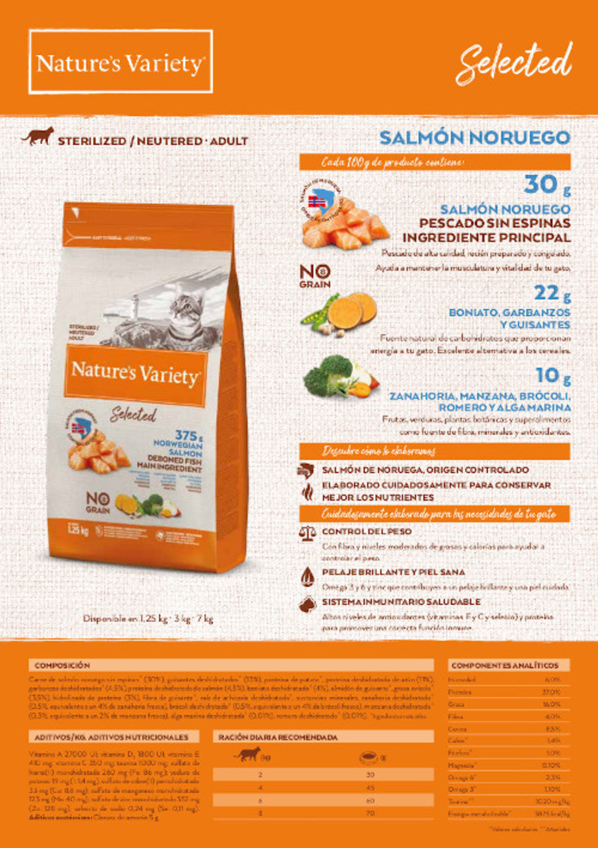 Elaborado con >30% de carne de salmón noruego sin espinas como principal ingrediente.